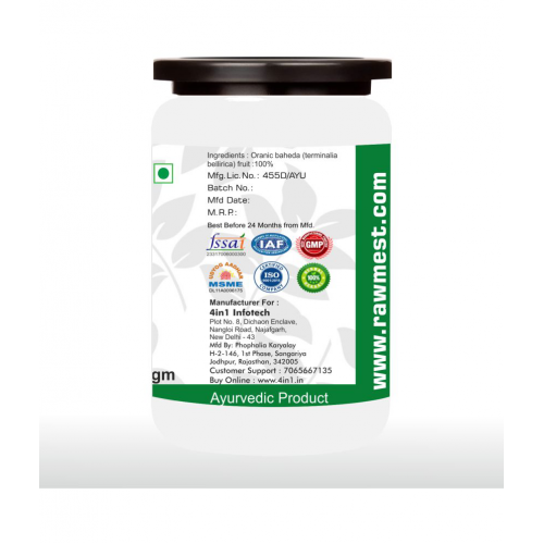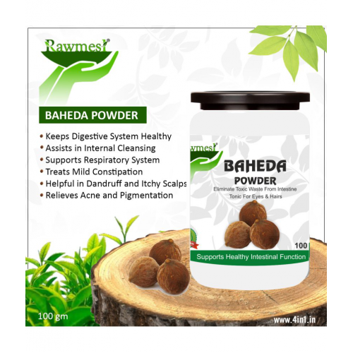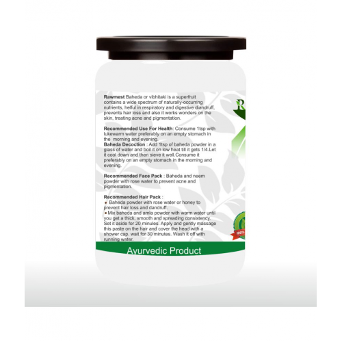 Rawmest Baheda (Bibhitaki) Powder OR Vibh9itaki is a super fruit contains a wide spectrum of naturally- occurring nutrients, helpful in respiratory and digestive dandruff, prevents, hair loss and work wonders on the skin, treating acne and pigmentation. Recommended use for health :- Consume 1 tsp with lukewarm water preferably on an an empty stomach in the morning and evening. Rawmest Baheda Powder Decoction :- Add 1 tsp of baheda powder in a glass of water and boil it on low heat till it gets 1/4 let it cool down and then sieve it well. Consume it preferably on an empty stomach in the morning and evening.